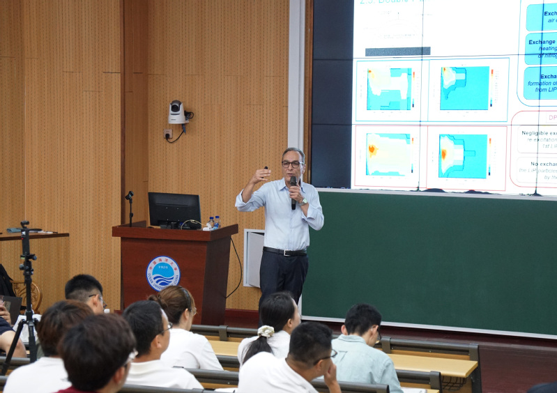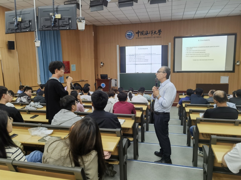 7月2日上午,Alessandro De Giacomo教授在崂山校区教学楼八区8101教室作了题为“Laser-induced plasma dynamics: from atomic and molecular spectra to particle formation”的学术报告,报告由学部物理与光电工程学院郑荣儿教授主持,来自山东大学、麻豆a片 、青岛大学、齐鲁工业大学、中国科学院海洋研究所、中国科学院青岛生物能源与过程研究所、青岛海洋科技中心等多家单位的60余名教师、研究生和本科生参加了本次报告。De Giacomo教授针对激光诱导等离子体(laser-induced plasma)相关领域的基础理论、关键技术和典型应用进行了详细的讲解,引起了参会师生的浓厚兴趣及热烈讨论。