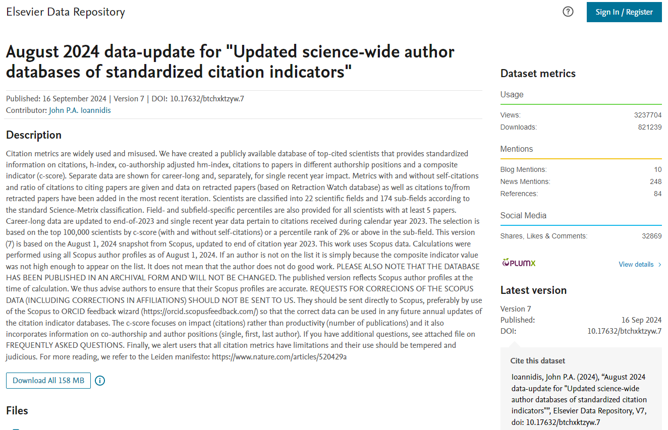 近日,美国斯坦福大学John P.A. Ioannidis教授团队联合爱思唯尔出版社发布了第七版《全球前2%顶尖科学家榜单2024》(World’s Top 2% Scientists 2024),主要分为“终身科学影响力排行榜” (career-long impact)和“年度科学影响力排行榜”(single year impact)两个榜单,分别对应1960~2024年及2024年度两个时间区间综合数据。