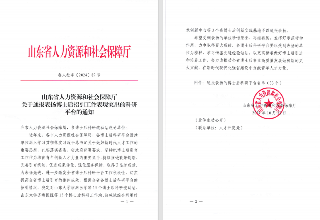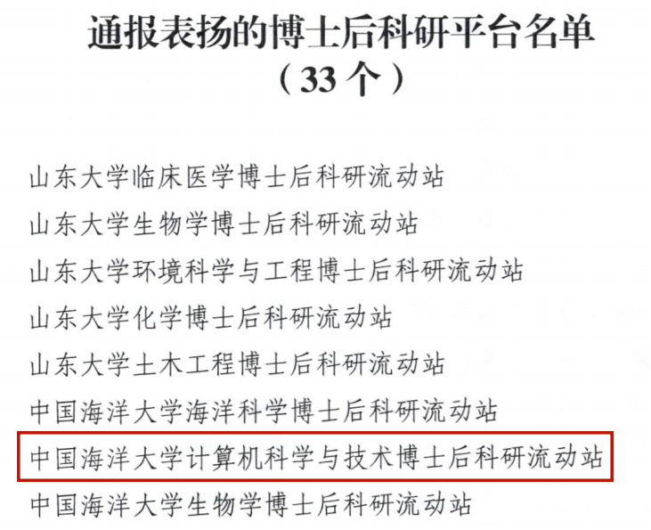 近日,山东省人力资源和社会保障厅通报表扬了博士后招引工作表现突出的科研平台,麻豆a片 计算机科学与技术博士后科研流动站获通报表扬。据悉,全省通报表扬的科研博后流动站共33个,麻豆a片 共有3个科研博后流动站荣登表扬名单。