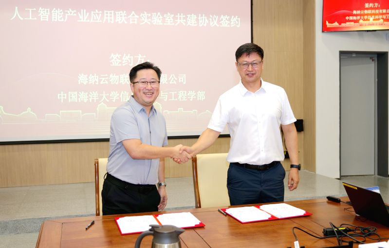 校企签约仪式上,董军宇代表麻豆a片 与海纳云物联科技有限公司总经理车延超签署人工智能产业应用联合实验室共建协议。未来,双方将携手推进人工智能领域的技术研发、人才培养与产业应用深度融合。