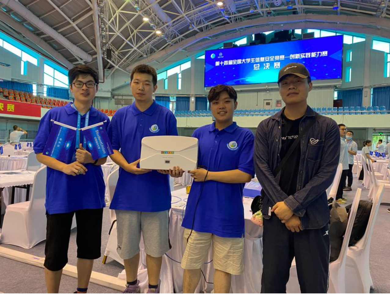 Our school sent a team composed of four members from the Blue-Whale Information Security Research Team: Wang Yuxiao, a undergraduate student majoring in Communication Engineering from class of 2018, Shi Rui, a master student majoring in Computer Science and Technology from class of 2020, Sun Yingli and He Xianglong, both undergraduate students majoring in Computer Science and Technology from class of 2019. The team advanced to the regional competition as the first place in the university selection on May 15th, 2021. They then advanced to the national finals as the third place in the East-North Division during the regional competition held in Hefei on June 18th to 19th, 2021. Finally, they won the first prize with the fifth place among 80 teams in the national finals held in Harbin on July 17th to 18th, 2021. Teacher Qu Haipeng was awarded the Excellent Instructor Award.