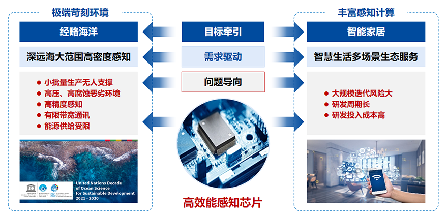 满足市场需求,提升产业竞争力。近年来,物联网、5G、人工智能等信息技术迅猛发展,感知计算是以上新一代信息技术的底层核心技术之一,随着应用场景的不断丰富,覆盖范围的快速增强,性能、功耗、成本成为制约这项技术发展的主要限制瓶颈,感存算一体融合的高效能感知芯片技术具有低功耗、高性能、高一致性、体积小、单片成本低等优点,是有效突破这些限制瓶颈的技术方向,特别是在解决极端苛刻环境和丰富人-物交互下的感知计算问题上,更需要高效能的感知计算芯片,在推动新一代信息技术、现代海洋等产业的新旧动能转换和高质量发展中有着重要意义。