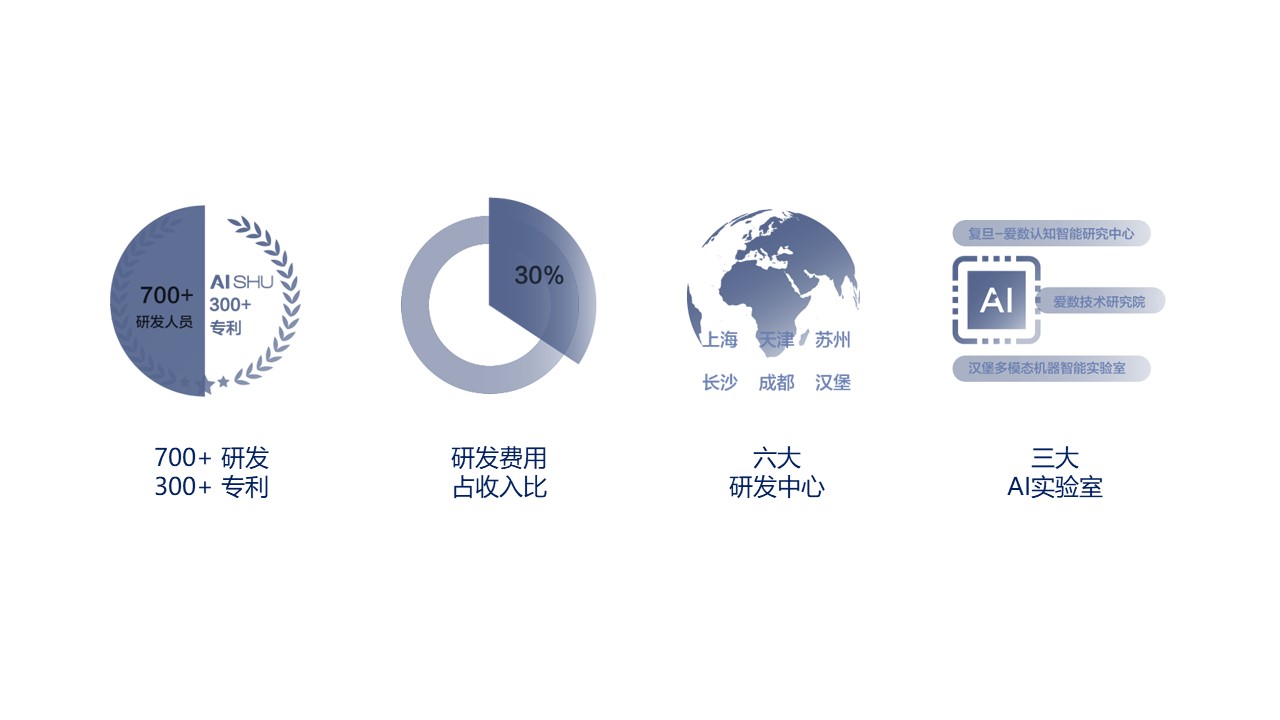 爱数,专注数据能力的技术型公司:爱数拥有研发人员700+,专利300+;在上海、成都、长沙、天津、苏州、德国汉堡设立全球六大研发中心;建立了三大AI实验室:爱数技术研究院、复旦-爱数认知智能研究中心、汉堡多模态机器智能实验室;每年公司营收超过30%用于研发投入。