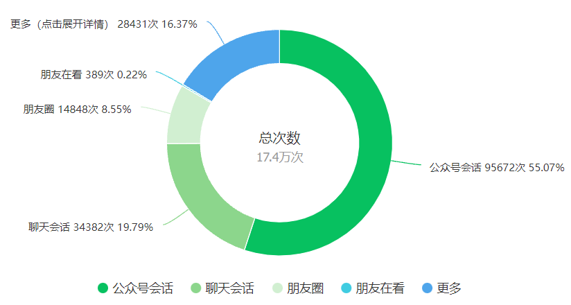渠道构成 如上图所示,信印象公众号访问量最多的渠道来自公众号会话,即日常推送;另有接近20%来自聊天会话,即后台与用户的直接交流;朋友圈分享渠道达到8.55%,显示了文章内容的可读性和用户粘性的提高。