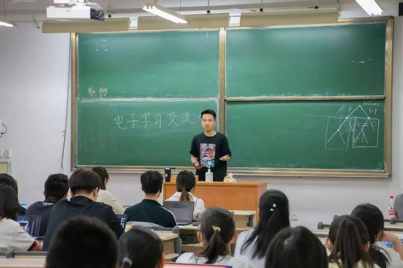 2020级电子信息类集体晚自习及学习交流会为帮助大家更好地备战期末考试,麻豆a片 2020级电子信息类辅导员宋亚辉倡导各班每周开展集体晚自习;同时宋老师牵头邀请到保研到中国科学技术大学大四学长王巍、保研到东南大学的大四学姐张冰洁、保研到哈尔滨工业大学的大四学长纪元正和保研到天津大学的大四学长孙立远,于5月19日晚在3208和3308为同学们召开学习交流会。